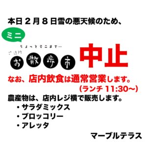 ごめんなさい。本日のミニお散歩市は、雪のため中止します。赤ちゃんえほんや、ギター生演奏に、布小物、楽しみにしてくださっていた方、申し訳ございません。 お店は通常営業しておりますので、ランチぜひご利用ください。日替ランチは、ロール白菜です。私は朝イチ投票してきましたが、選挙に行かれる方、足もとどうぞお気をつけてください。